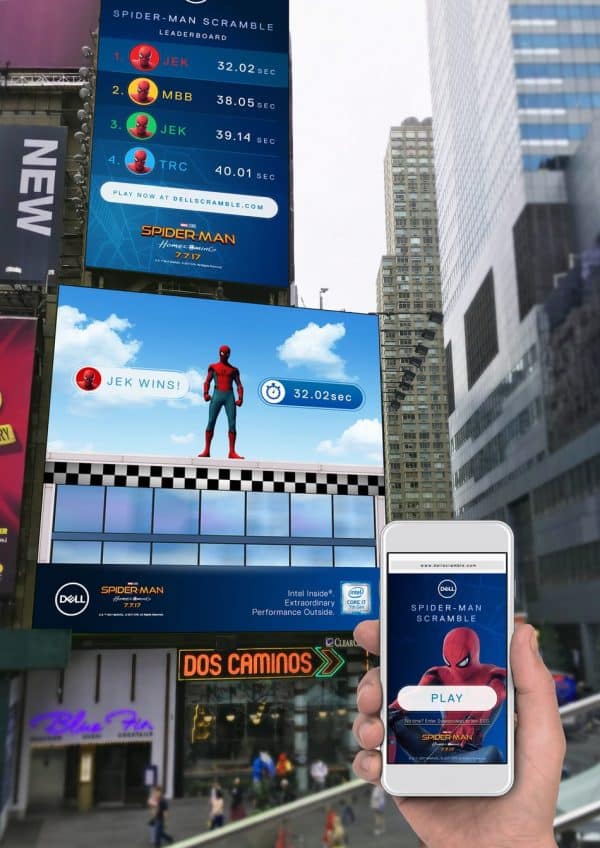Un altro elemento promozionale includerà la presenza di cartelloni interattivi a Times Square che consentiranno ai consumatori di giocare al gioco “Spider-Man Scramble”. Durante il videogioco in diretta, i consumatori utilizzeranno i loro telefoni cellulari per correre in cima a un grattacielo di New York attraverso i cartelloni pubblicitari. L’esperienza live del videogioco sarà in diretta sul cartellone digitale di Clear Channel Outdoor su Broadway dal 30 giugno al 1 luglio e il 7-8 luglio, in coincidenza con l’uscita nelle sale USA.