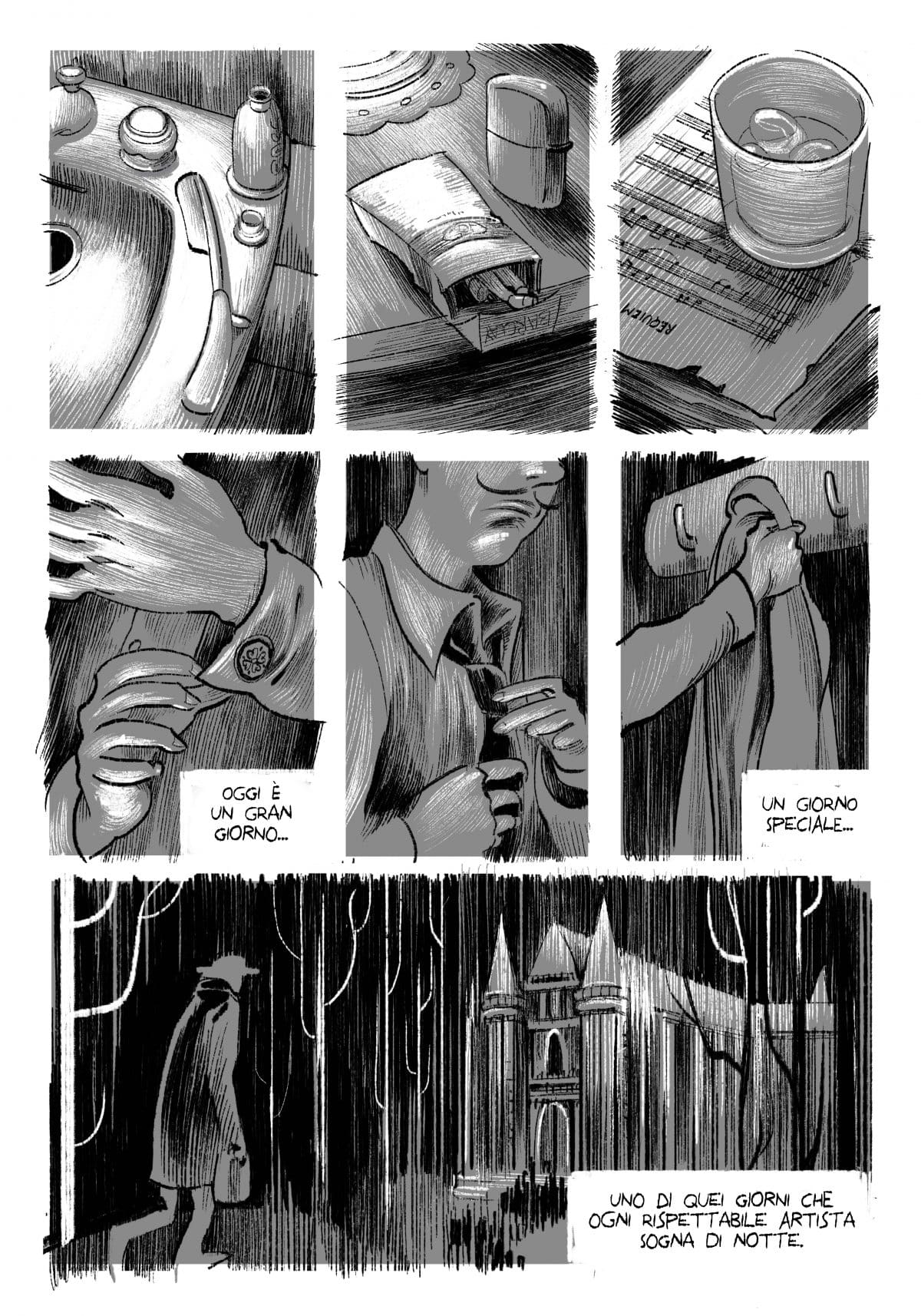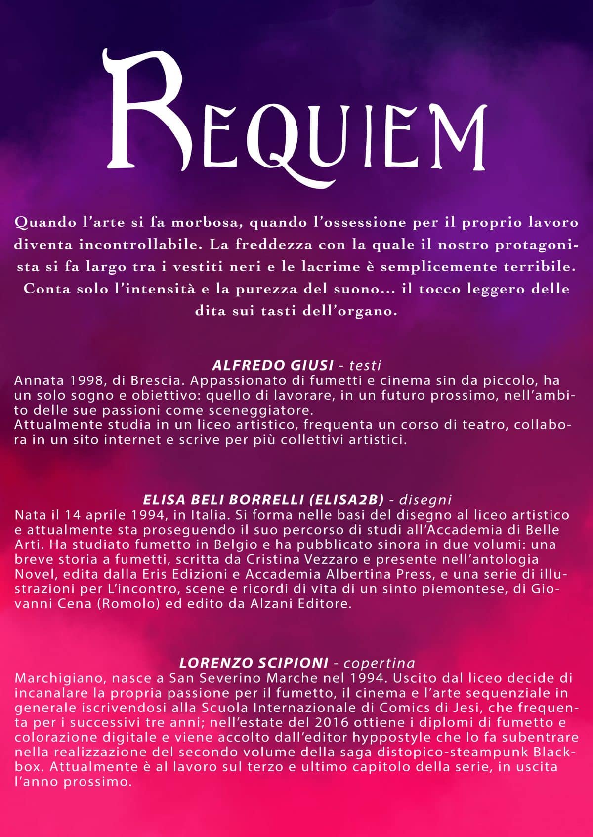 Dopo The Mighty and Deadly Iron Gang di Officina Infernale, Tumorama di Pablo Cammello, Restiamo sdraiati qui per sempre di Federico Chemello e Alberto Massaggia, The Pretender di Bartolomeo Argentino, Antonello Cosentino e Francesco Montalbano, Lo Spazio Bianco è lieto di ospitare le opere de La Stanza, un collettivo composto da giovani e promettenti autori. “Requiem” è un racconto breve scritto e sceneggiato da Alfredo Giusi e disegnato da Elisa2B (Elisa Beli Borrelli). Copertina di Lorenzo Scipioni.
