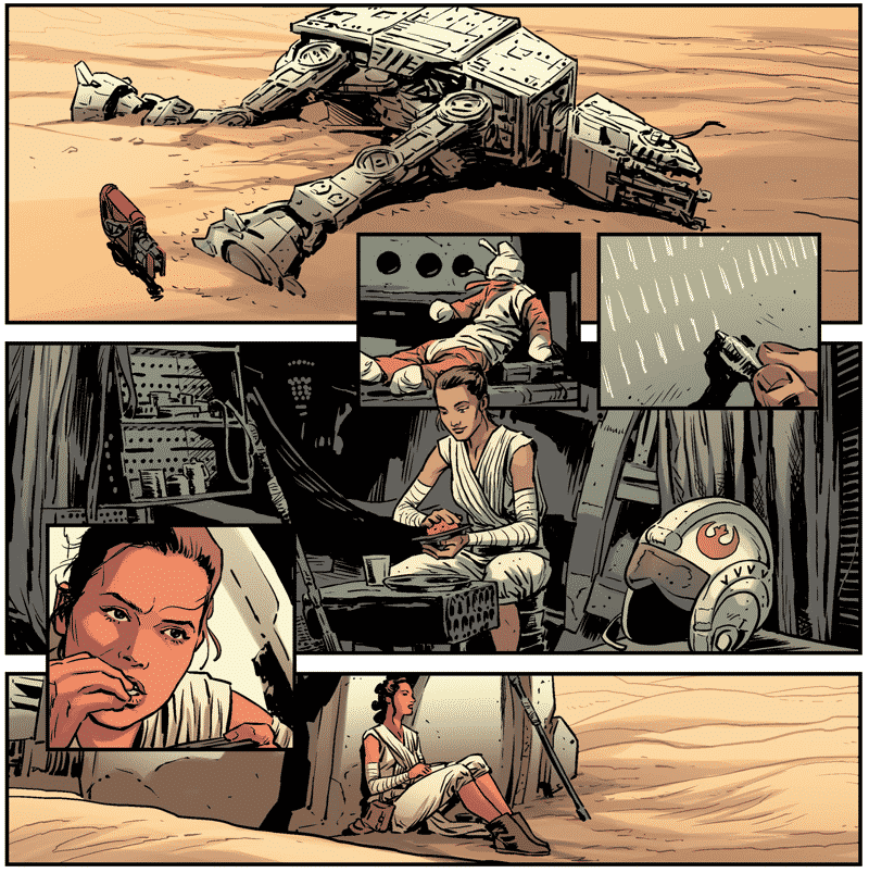 Le tavole di Luke Ross ci riportano su Jakku: ci interroghiamo ancora sulle origini di Rey, diamo il benvenuto a nuovi personaggi e salutiamo vecchie glorie. I disegni sono eleganti, accurati, con tratti netti che catturano con intensità espressioni ed emozioni degli attori.