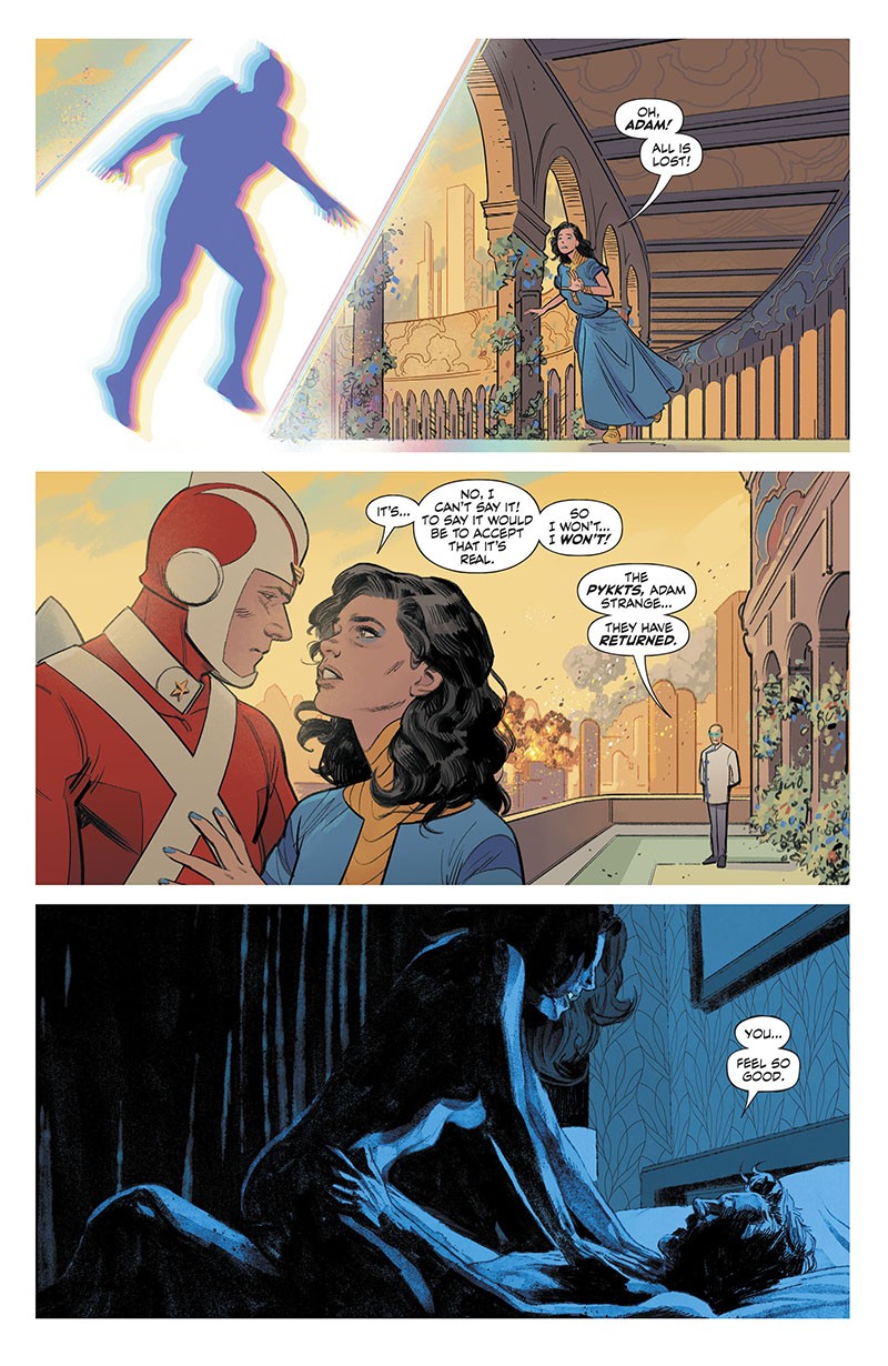 Svanisce ogni cura per la coerenza interna: Alanna e Mr. Terrific riescono non solo a farsi ricevere dai P’ykt, per giunta tranquillamente armati fino ai denti, ma anche a farsi restituire la bambina e convincerli a rinunciare all’invasione della Terra senza troppe difficoltà. È come se i protagonisti sapessero o come se fosse accaduto qualcosa di fondamentale che ci viene tenuto nascosto, né mai rivelato, nemmeno in uno spiegone a posteriori. La narrazione fa una sorta di salto triplo fuori scena, staccando da Alanna piegata sul corpo esanime di Strange e ripartendo con lei e Mr. Terrific che approdano sulla nave madre P’ykt: nel giro di poche tavole, uno scontro a fuoco e poche parole – peraltro in una sequenza che, presa a sé, è molto efficace per dinamismo e dialoghi secchi.