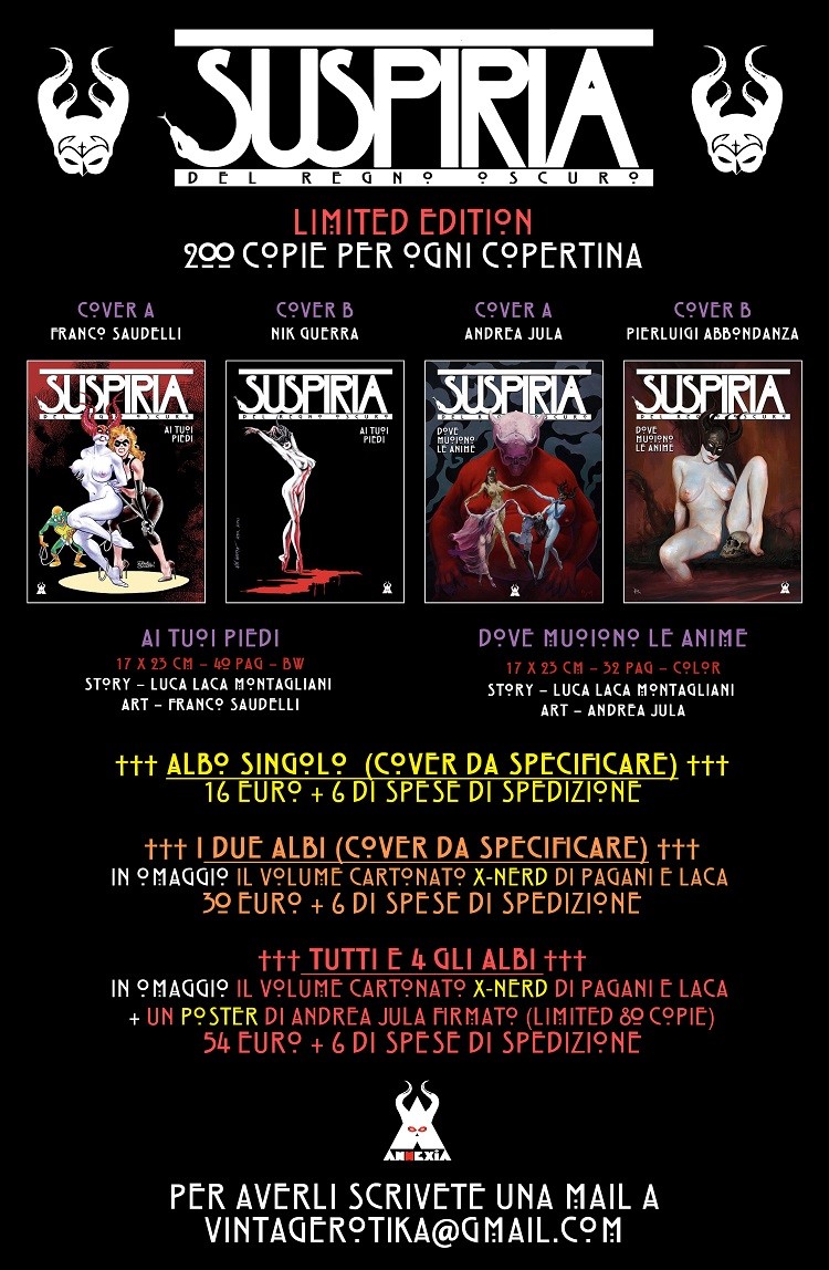 La produzione Annexia per il 2021 vedrà l’uscita della terza ondata di albi vintagerotici e nuove storie di Suspiria di con il grande ritorno di Andrea Bulgarelli per la seconda storia lunga suspiriana (Cuore di fiamma), la ristampa del primo volume (La piccola morte) nel nuovo formato più grande, e devastanti sorprese heavy metal che verranno svelate nel corso dell’anno nuovo.