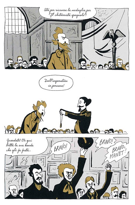 muovono seguendo la formazione degli artisti che porteranno alla nascita dell’Impressionismo. Nel 1861 Eduard Manet viene accolto nel Salone con l’opera che dà il titolo al libro: Il chitarrista spagnolo, un ritratto di piccolo formato ispirato ai pittori spagnoli, caratterizzato da contorni duri e colori scuri. Edgar Degas si dedica alla pittura dal vivo delle ballerine, ritratte all’interno delle palestre di danza. Claude Monet, a sua volta, vive vendendo caricature ma si rende sempre più conto del suo bisogno di essere inquadrato in un percorso istituzionale come quello dell’Accademia.