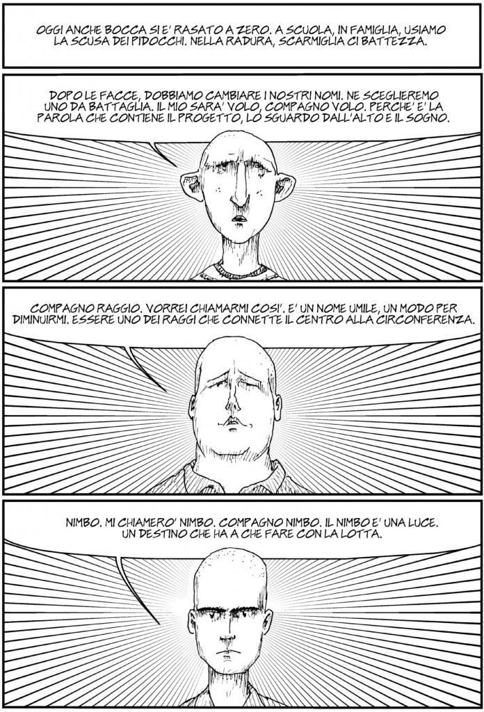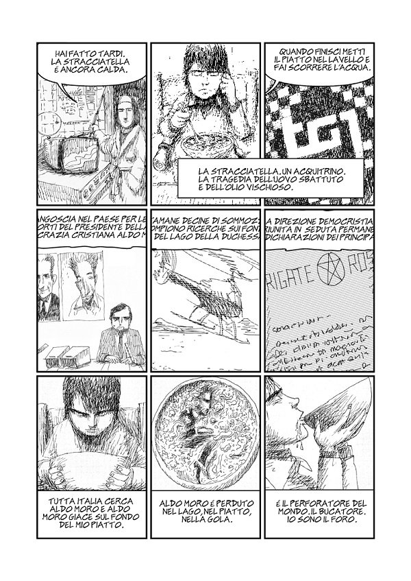 Nella desolata e sonnolenta Palermo del 1978, tre anomali undicenni trovano una linea comune di pensiero nei comunicati di rivendicazione che le Brigate Rosse rilasciano nell’ambito del sequestro di Aldo Moro. I tre, Nimbo (protagonista principale e voce narrante), Volo e Raggio, affascinati dal linguaggio e dal decisionismo delle BR, decidono così di formare il N.O.I (Nucleo Osceno Italiano), una cellula terroristica che, dopo alcuni atti di semplice e bambinesco teppismo scolastico, trascendono qualsiasi limite con il rapimento e il lento e terribile omicidio di Morana, loro introverso e isolato compagno di classe. Questa la trama de “Il Tempo Materiale”, che lo sceneggiatore e disegnatore Luigi Ricca ha tratto dall’omonimo romanzo di Giorgio Vasta edito nel 2008 dalla Minimun Fax. La graphic novel di Ricca è una profonda riflessione sulla costante inadeguatezza del “paese” Italia e sul male primigenio; male che prende in prestito il volto innocente e inverosimile dei tre componenti del N.O.I. Tre bambini precoci e degenerati che scimmiottano la cronaca nera nazionale e i loro particolari “paladini”. Bambini i cui ragionamenti, contorti e alieni, instillano angoscia e sgomento nel lettore. Allora è necessario conoscerli meglio. È importante capire e sapere che potrebbero esistere.