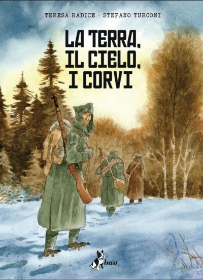 La terra, il cielo, i corvi, nuovo libro di Teresa Radice e Stefano Turconi, nato nella loro Casa senza Nord, definizione romantica della loro dimora-laboratorio, dopo una gestazione di oltre tre anni, trasporta il lettore alla campagna di Russia dell’inverno a cavallo tra il 1942 e il ’43; si tratta di una pagina tragica per il nostro paese e che ha nella testimonianza scritta da Giulio Bedeschi in Centomila gavette di ghiaccio e nel lavoro di Mario Rigoni Stern i riferimenti che Teresa Radice, da poco insignita del Gran Guinigi d’oro per la sceneggiatura de Le ragazze del Pillar, ha fatto propri.