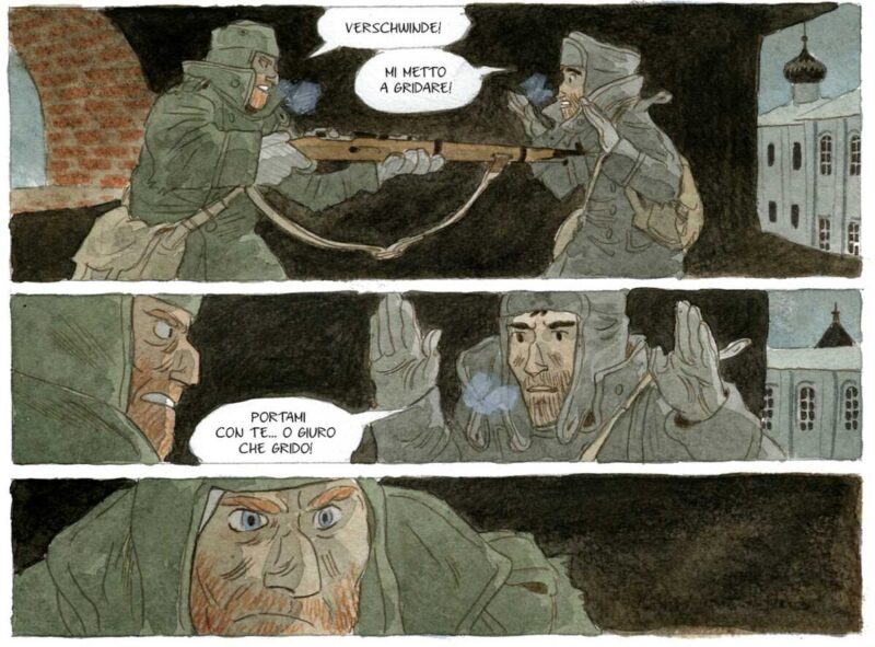 Bastano poche strisce per conoscere il soldato del Reich e osservare come faccia il male che deve. È un soldato, non un assassino e per questo motivo, seppure a malincuore, è costretto a subire l’alleanza con l’italiano e successivamente con Vanja, il soldato russo che fa prigioniero durante la fuga.
