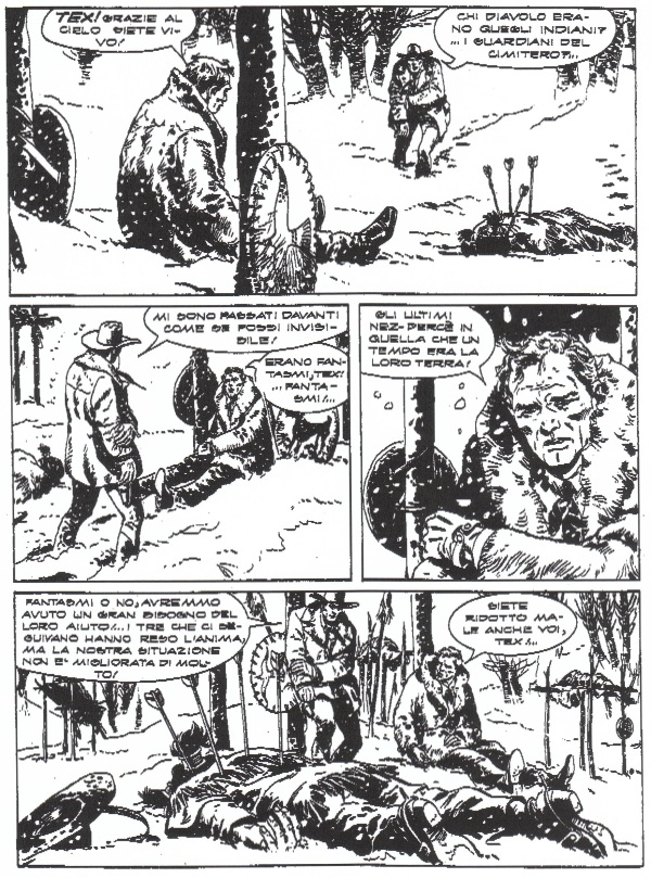 Una perfetta simbiosi. Tex sa che il cavallo rappresenta l’unica sua speranza di sopravvivenza in molte situazioni piuttosto frequenti in quell’ambiente. I cavallo ricambia con fedeltà alle cure mirate ed efficaci di un tale cavaliere.