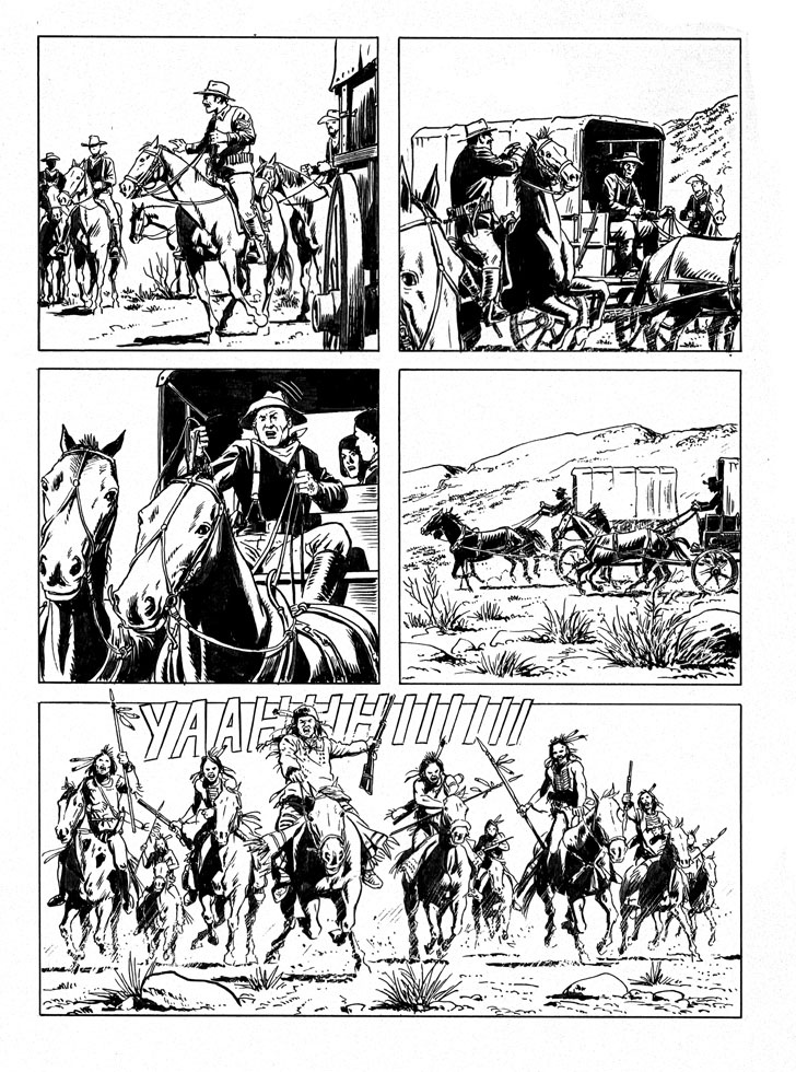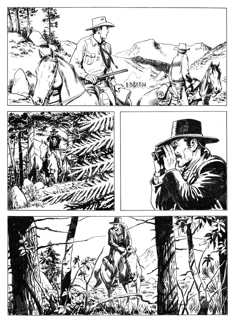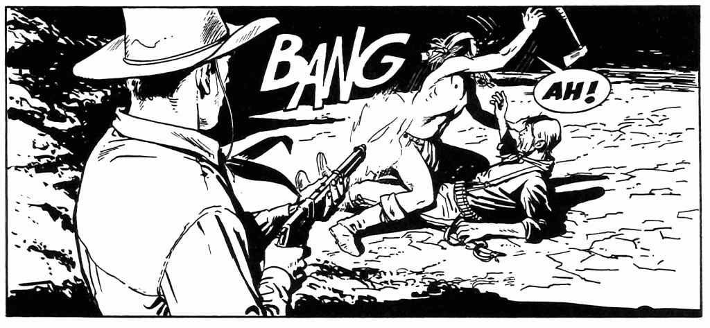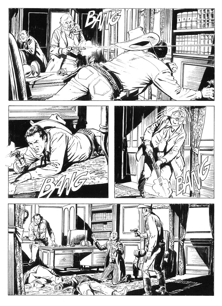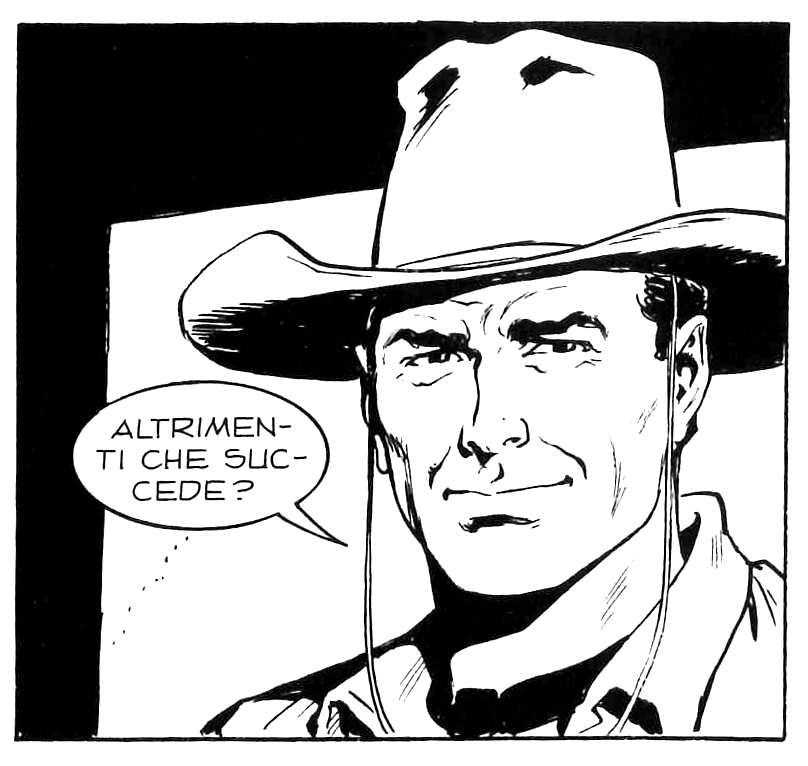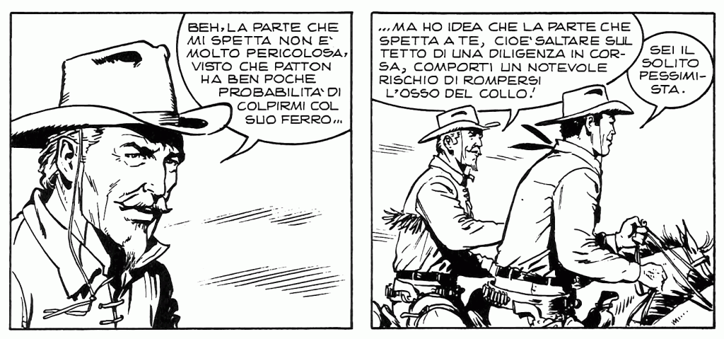 Beh, portare immacolata una camicia gialla per le polverose praterie del west non è da tutti. Qui però prevale una sorta di caratteristica–limite del medium fumetto. E’ sempre difficile rappresentare l’aria vissuta e stazzonata nella bidimensionalità del disegno in bianco e nero. I personaggi a fumetti hanno sempre un’aria pulita, stirata e spazzolata, ben lontana da quella degli eroi polverosi e usurati degli spaghetti western.