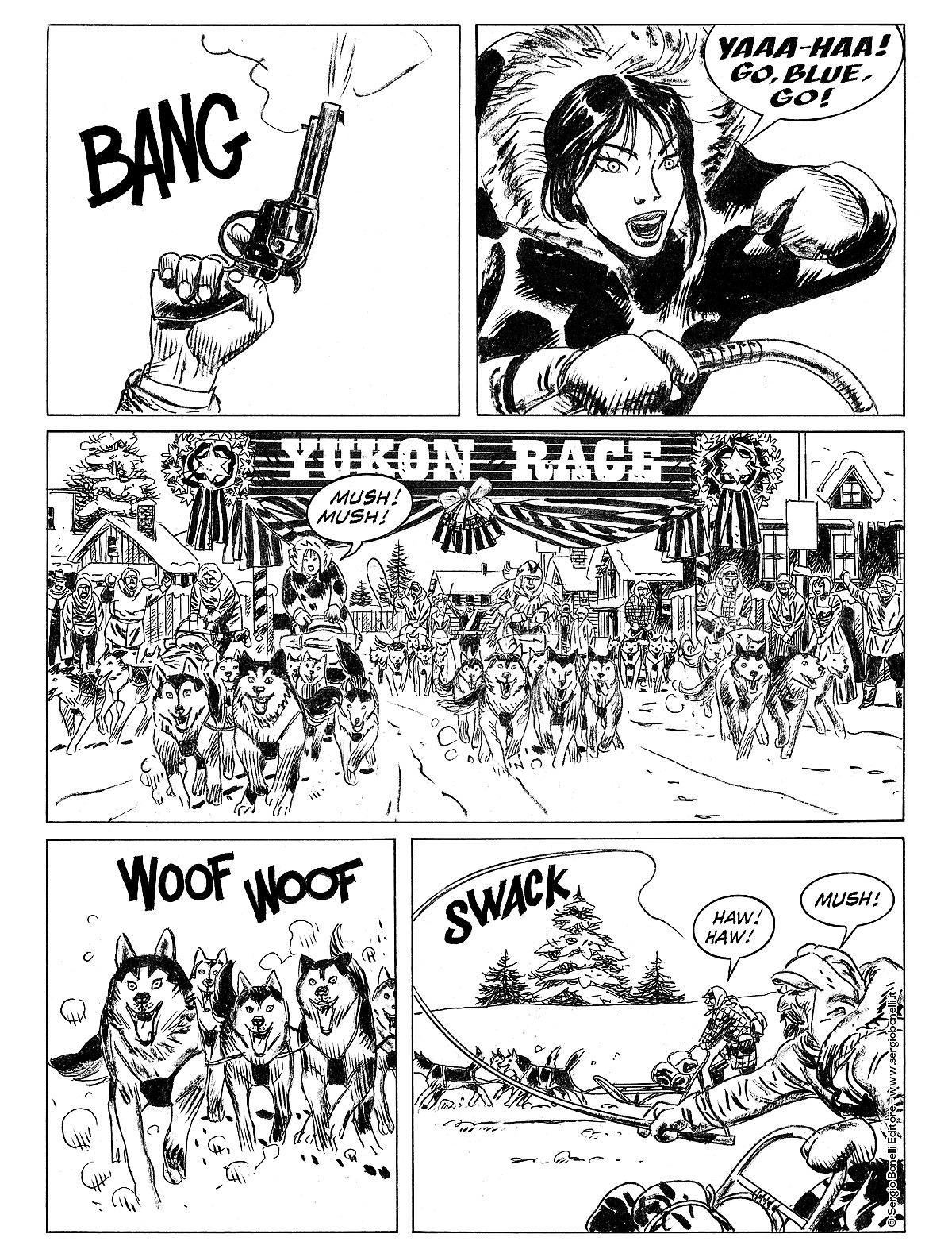In Yukon Race, sceneggiata da Giorgio Giusfredi (anche lui vantante trascorsi con lo Spirito con la scure), per le matite di Alfonso Font, Aquila della Notte lascia il posto a Gros-Jean e alla sua figlioccia Dawn, alle prese con una gara organizzata da un allevatore di cani da slitta senza scrupoli. Si tratta di un episodio ben congegnato da Giusfredi, che sfrutta a suo vantaggio la limitata foliazione riuscendo a proporre un’avventura piuttosto ricca di avvenimenti, con un tono esorbitante che ben si sposa con le caratteristiche del vulcanico trapper canadese, che nell’ultima scena è protagonista di una simpatica rievocazione dei suoi esordi sulle pagine di Tex.