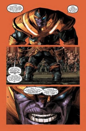Balzano all’occhio le didascalie, poiché si rifanno a una classicità che difficilmente troviamo nei fumetti di oggi. Non leggiamo i pensieri di Thanos o di suo figlio, ma le osservazioni di un narratore onnisciente che si rivolge direttamente ai personaggi o a noi lettori, accompagnandoci in un percorso che prevede molteplici tappe spazio-temporali. Dal consueto “Intanto…” all’esclamazione “Oh, sì, folle titano. Sono tutti morti“, la voce fuori campo si modula secondo diversi registri, spesso alimentando il pathos, di rado risultando ridondante.