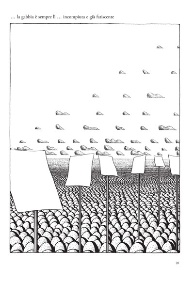 Quando nel 1975 fu pubblicata a Toronto per la Couch House Press in tiratura di sole millecinquecento copie The Cage, prima ancora che a una corretta e oggettiva esegesi, sfuggiva a qualsiasi catalogazione. Suonava come una forzatura persino collocarla nel calderone del fumetto. In fondo cosa aveva del fumetto? Nessun personaggio, nessuna nuvoletta con testo, disegni che sacrificavano l’espressività in favore di un’oggettività fotografica. La stessa sequenzialità di vignette che costituiva del fumetto l’impianto comunicativo veniva messo in discussione da un’impostazione che non prevedeva più di una vignetta per pagina. Ovviamente non si trattava certo del primo esperimento nell’ambito della scena underground del fumetto di fine anni settanta, ma era comunque difficile rintracciarvi qualcosa che permettesse di risalirne all’ispirazione.