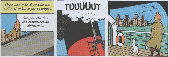 Incontriamo tuttavia momenti suggestivi: l’immagine di Tintin che si muove sul davanzale della finestra del suo albergo dà un vero senso di vertigine, con il suo reticolo prospettico di vuoti e pieni (pag. 10); la compressione in una tavola (pag. 29) della spoliazione dei nativi da parte delle compagnie petrolifere appoggiate dall’esercito e della trasformazione del territorio da prateria a città dei bianchi riesce a comunicare un senso di profondo disagio e la tavola di congedo, con il trionfo di Tintin e Milou per le vie di Chicago pavesate a festa, il saluto all’America da parte del giovane reporter mentre sale sulla nave (“Che peccato. Ora che cominciavo ad abituarmi“) e la sua immagine di spalle che guarda in distanza il profilo della città, offre un senso di sollievo e sospensione che assorbe e spegne con naturalezza la frenesia senza respiro dell’avventura.