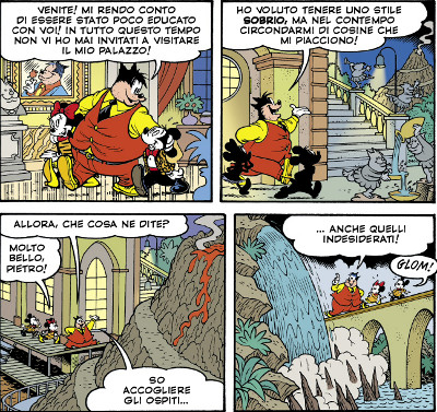 L’enorme statua di Gambadilegno, il suo palazzo elegante ma comunque imponente, con tanto di trappole magniloquenti disseminate qua e là, e exploit grafici come il logo dell’Ingambissimo, che ricorda il classico smile giallo di Watchmen, nel quale stavolta l’inquietudine non è data dallo schizzo di sangue ma dalle similitudini con il volto di Gambadilegno, costituiscono gli elementi estetici di interesse della storia, che si esaltano in particolare in alcune quadruple ad effetto.