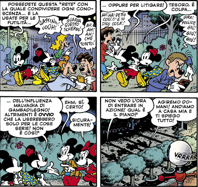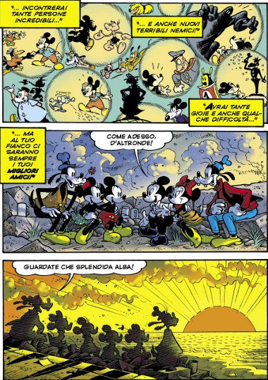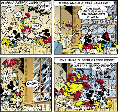 Dal punto di vista tecnico, peraltro, molto raffinata è l’idea di far precedere l’avventura, nei quattro numeri di Topolino antecedenti, da brevi prequel di 5 tavole ciascuno, presentando un ottimo mix tra le atmosfere un po’ naif del Mickey Mouse delle daily strip e quelle più moderne e meditate alla Romano Scarpa.