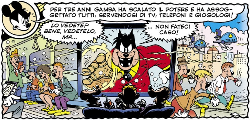 Generalizzando questa lettura, si potrebbe affermare che anche dal punto di vista politico un governo distopico come quello creato da Gambadilegno non sarebbe comunque possibile senza le scelte dei cittadini, tutto sommato contenti di vivere nel mondo dell’Ingambissimo dove ogni “contrariamento” è bandito per legge.