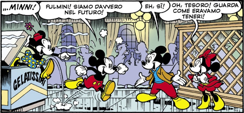 Nella storia precedente Topolino viaggiava indietro nel tempo fino a incontrare il se stesso più giovane, vivendo un’avventura che nel corso degli anni aveva dimenticato. In modo piuttosto ovvio, per evitare il rischio di ripetitività, Casty decide con Tutto questo accadde domani di far arrivare i Topolino, Minni e Pippo degli anni Trenta nel nostro 2018.