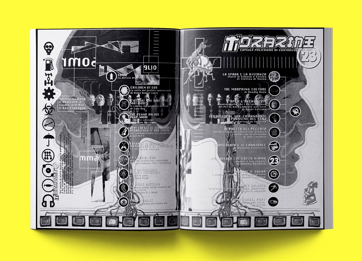 Copertine in cui il volto di Che Guevara si sovrapponeva a quello di Charles Manson. Grandi reportage su droghe, marxismo acido, cospirazionismi improbabili, Barbie possedute e sesso deviante. Techno-fumetti disegnati a 180 bpm. Articoli inneggianti all’estinzione del genere umano che sembrano scritti da una setta di satanisti invasati. Bislacche incursioni cute dal retrogusto perverso. Un’estetica al contempo seducente e ributtante, raffinata e respingente, impregnata degli stessi colori avariati di un cartone di LSD andato a male.