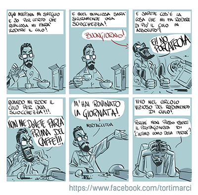 In mezzo a una bacheca di fb in cui spuntano normalmente selfie, notizie di ogni tipo più o meno vere, arricchite da complottismi e populismo, troviamo anche le irriverenti strisce di Riccardo Torti (“esticazzi come filosofia di vita”). Parentesi inaspettate che riescono sempre a strappare, se non una risata, perlomeno un amaro sorriso, dove l’autore non risparmia nessuno dalla sua gogna di misantropo, dagli avventori delle spiagge ai colleghi di studio. Raccogliere quindi i Torti Marci in un libro “scomodo” (per il formato, non per i contenuti) potrebbe essere di per sé una buona idea, visto che è anche arricchito di alcune strip più lunghe che, inaspettatamente, non fanno solo leva sull’irascibilità del nostro, che alla lunga avrebbe potuto risultare stucchevole ad alcuni palati. Lo stile di Riccardo Torti, che abbiamo già visto all’opera su Dylan Dog, e presto su 4Hoods, si adatta bene anche alla strip umoristica, grazie a un uso del colore quasi monocromatico e a un tratto deciso. Purtroppo, ciò che delude è la lunghezza dell’opera: in rapporto al prezzo e alla dimensione, ci si potrebbe aspettare un volume più cospicuo, che riesca a includere anche altre vignette inedite, o già pubblicate. Sconsigliato se siete maniaci dell’ordine estetico delle librerie.