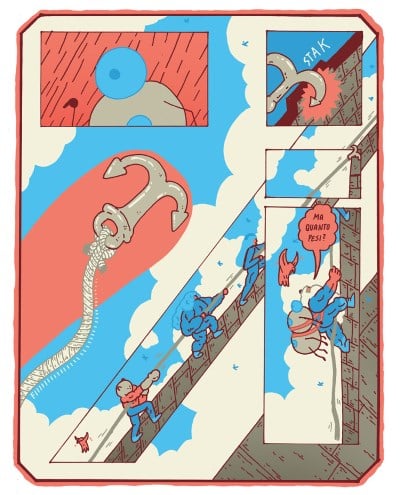 Prima di lavorare nel mondo del fumetto e dell’illustrazione sono partito collaborando con diversi locali in veste di grafico. Gli equilibri tra spazio, testo ed immagine erano sempre all’ordine del giorno e con l’esperienza mi sono reso conto di come la “matematica” dietro all’impaginazione, avesse dentro di se una forza narrativa potente e a volte quasi mistica. Poi sono arrivati tra le mie mani le fantastiche tavole di Jacobs e Ware, ed è li che è partita la
