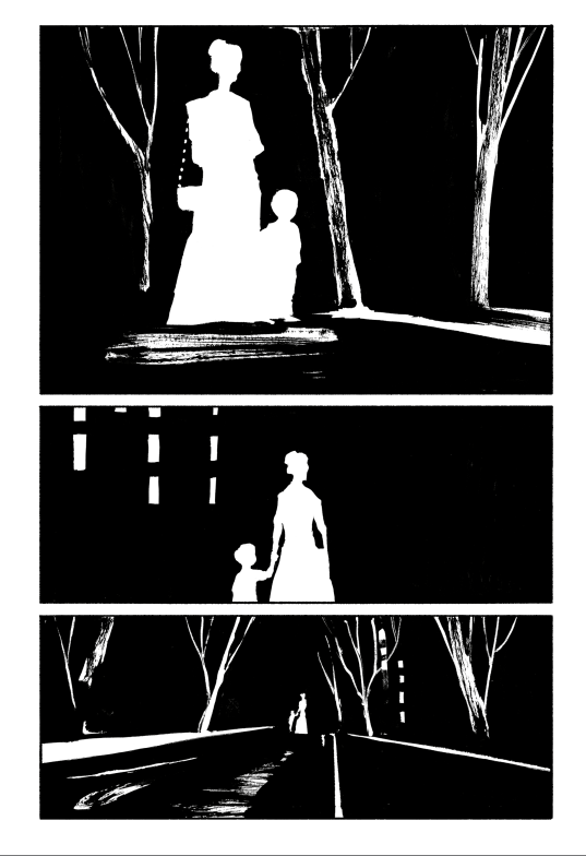 C’è un lavoro attento, in effetti, sulle ombre e sui chiaroscuri. Ci sono addirittura fasci di luce che sono neri. È un lavoro in cui sono state utilizzate diverse tecniche che donano alle ombre e al nero diversi registri. Danno la sensazione che ci sia qualcosa dentro, un mistero oscuro, quasi brulicante. Quindi, e mi rivolgo più a Maurizio, che tecniche hai usato per ottenere questo effetto e come hai lavorato all’atmosfera e alle ambientazioni del fumetto?