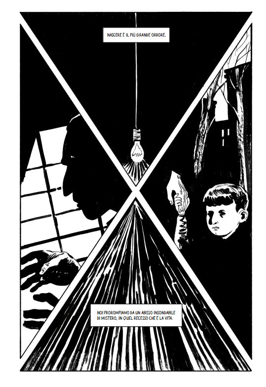 Marco: È vero, il fumetto è uno dei pochi mezzi che riesce a rendere questo aspetto del punto nel tempo: in un punto passano infinite rette, così come in un punto temporale passano infiniti tempi, in continuazione. In altre parole, il punto è sia eterno che istantaneo. Il fumetto definisce questa cosa in maniera perfetta: in una vignetta Lovecraft è seppellito, nell’altra è giovane. Puoi tornare indietro, puoi andare avanti, è tutto quanto nella pagina.