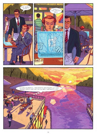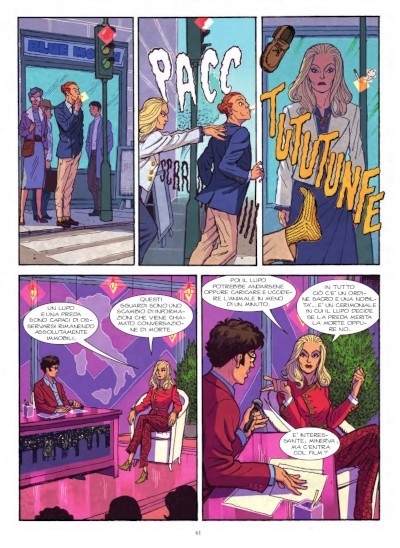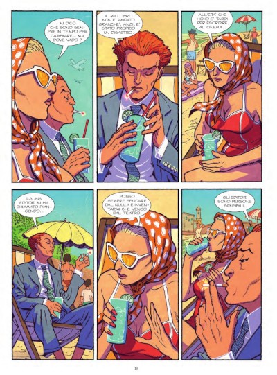 Notevoli e di grande intensità infine alcuni scorci romani, notevole anche la cura nell’arredare gli interni – gli uffici della rivista per cui lavora Alceste, il salone della contessa in cui si tiene l’ennesima festa glamour, la camera d’albergo in cui vive il protagonista – e la gestione della gabbia, sempre su due strisce come da impostazione della serie e all’interno della quale Ponchione ricorre in un paio di occasioni allo stratagemma di far continuare l’azione tra un riquadro e l’altro.