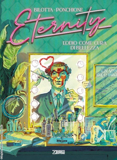 In quest’occasione è portato avanti dalla stessa Minerva, sorta di Giano bifronte al femminile – riferimento mitologico già richiamato esplicitamente da Bilotta nel villain Ianus creato per la sua storia di Batman pubblicata nel volume Il mondo – dalla natura piuttosto incongruente e con veri e propri eccessi, ma soprattutto dalla piega slapstick di questa storia. Ancora una volta, con Eternity Bilotta abbraccia il fumetto nella sua espressione più ampia, in questo caso orchestrando alcune scene nelle quali Alceste viene malmenato e acciaccato in maniera crescente e in modi sempre più iperbolici e a tratti comici, che infatti non stonerebbero in un fumetto umoristico. In ciò è aiutato anche dai disegni di Sergio Ponchione, che in questi frangenti carica la recitazione e i movimenti per suggerire la pantomima in atto, e dai colori di Adele Matera, che per esempio nella vignetta della testata sul setto nasale si fanno particolarmente pop.