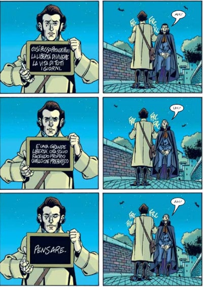 Un’ultima annotazione è d’uopo per i toni onirici che si rintracciano in alcuni passaggi della storia, quando il protagonista sente parlare alcuni animali e addirittura indovina i pensieri del muto Belforte. Che siano conseguenze delle ormai note allucinazioni indotte dalle misture chimiche a cui è stato esposto nelle avventure passate o frutto della sua fantasia tormentata, costituiscono in ogni caso un vezzo straniante utilizzato da Bilotta per destabilizzare tanto il lettore quanto il personaggio stesso. Interrogarsi sulla natura di queste “visioni” non appare più utile o calzante che cercare un’indagine di stampo classico negli albi della serie. È il significato di questi confronti che deve invece interessare.