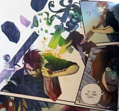 Anche la scelta di far accadere più azioni non contemporanee all’interno della stessa vignetta priva di respiro certi passaggi e rischia più volte di rendere vano l’effetto drammatico o epico: se nella stessa vignetta assistiamo a un’antagonista che pugnala alle spalle uno dei protagonisti, il quale si accascia a terra, mentre la spada/pugnale (che nella vignetta sembra abbastanza grande da staccargli un braccio e parte del busto, mentre in quella dopo viene afferrata praticamente con una sola mano) si spezza in due e contemporaneamente un altro personaggio afferra una colonna di marmo (!) e la rompe addosso all’antagonista stessa, ci troviamo di fronte a troppa roba messa tutta insieme senza la possibilità di apprezzare lo sviluppo dell’azione stessa, tanto che nelle vignette successive deve essere spiegata con dialoghi che sottolineano “Ti… ha… pu… gnalato…” e “Questa non l’ho tirata giù neanche colpendola con una colonna”.