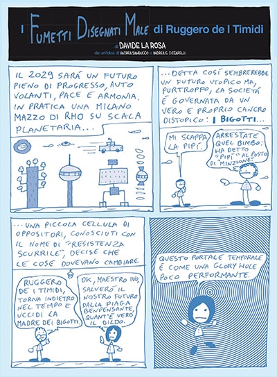 La prima cosa è l’umiltà. Ho subito ammesso che scrivere la sceneggiatura per un fumetto non è come scrivere, per esempio, la sceneggiatura per un video; per questo mi sono subito affidato all’editore, partendo dall’idea di base propostami e offrendo una sorta di supervisione insieme ad Andrea Ciccarelli. Quindi si è partiti dalle mie canzoni, cioè da qualcosa che avevo già scritto, riadattandole al fumetto. Io ho dato la “zampata finale”, sistemando qualche dialogo per renderlo il più “Ruggero” possibile. E devo dire che sono molto soddisfatto del risultato, perché all’interno del volume ci sono tipologie diverse di fumetti: la prima storia, di Giuseppe Zironi, è ambientata a New York ed è la continuazione della mia canzone Torna! (a Udine); la seconda, in stile manga, ha i disegni e colori di Stefano Conte; e poi ci sono contributi speciali tra cui i fumetti disegnati male da Davide La Rosa che è un matto e per questo ci vado molto d’accordo.