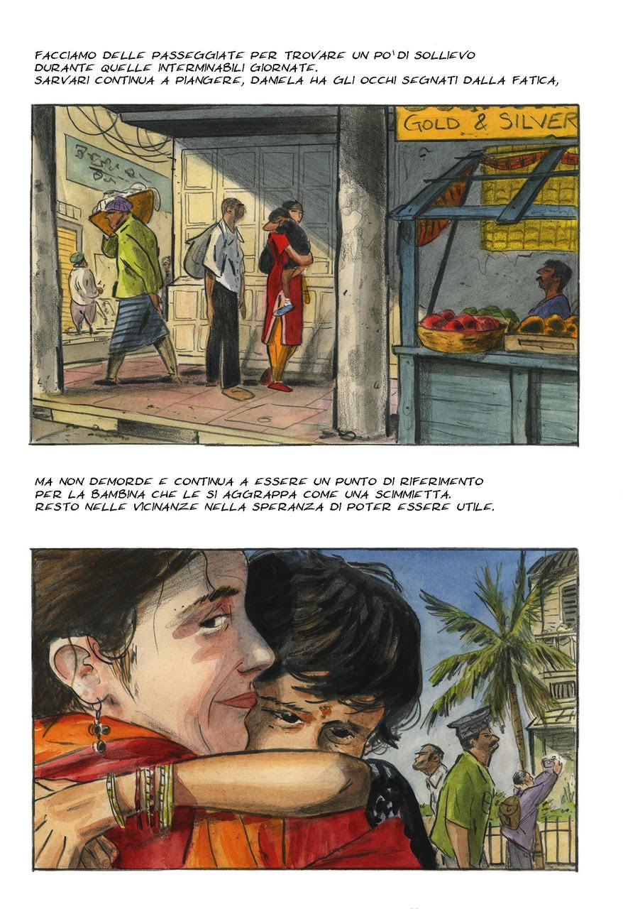 Diversamente dagli altri questo è un libro particolare, che rimarrà unico per me in questo senso. Volevamo usare gli acquarelli, anche perché questa storia non riuscivamo a vederla senza colori. Il colore è utilizzato anche in senso narrativo, scandendo il racconto in tre parti. La prima parte, monocromatica, per il racconto della vita genovese prima dell’idea di adottare, una seconda parte, con i colori della bandiera indiana, il verde il bianco e l’arancione, ad immaginare una nostra “idea” dell’India.