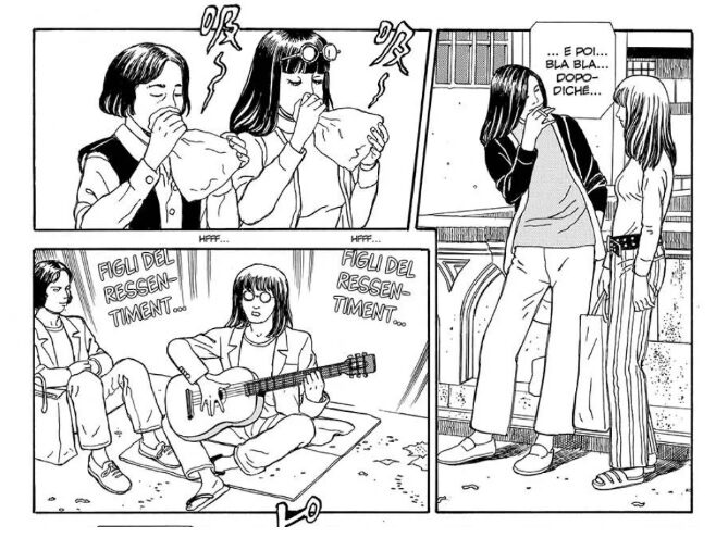 Su Sachiko pesa l’onere economico di dover badare a se stessa e al tempo stesso di dover aiutare i genitori, rimasti in provincia, che la vessano con continue richieste di soldi (“pensa ai soldi”, si ripete da sola); per farcela, deve subire lo sfruttamento sessuale da parte di diversi uomini. Migeru invece, frustrato per i rifiuti degli editori di manga (“pensa ai manga” è il suo motto ricorrente), finisce per incrociare sulla sua strada vagabonda le proteste studentesche caratteristiche di quel periodo storico, in Giappone e non solo. Complice la difficoltà a trovare una propria identità, finirà per radicalizzarsi sempre di più fino a partecipare ad azioni violente. Ma non è il solo: Migeru ha già incontrato sulla sua strada un ex compagno di scuola che si è trasformato in un serial killer. Il tratto che sembra accomunare tutti questi giovani personaggi è la provenienza da famiglie disfunzionali, che invece di prendersene cura hanno sfruttato questi ragazzi (un tema, questo, già visto in altre opere di Maruo); la loro disperata ricerca di senso, personale e collettivo, genera esiti molto diversi e, come facilmente intuibile, anche tragici.