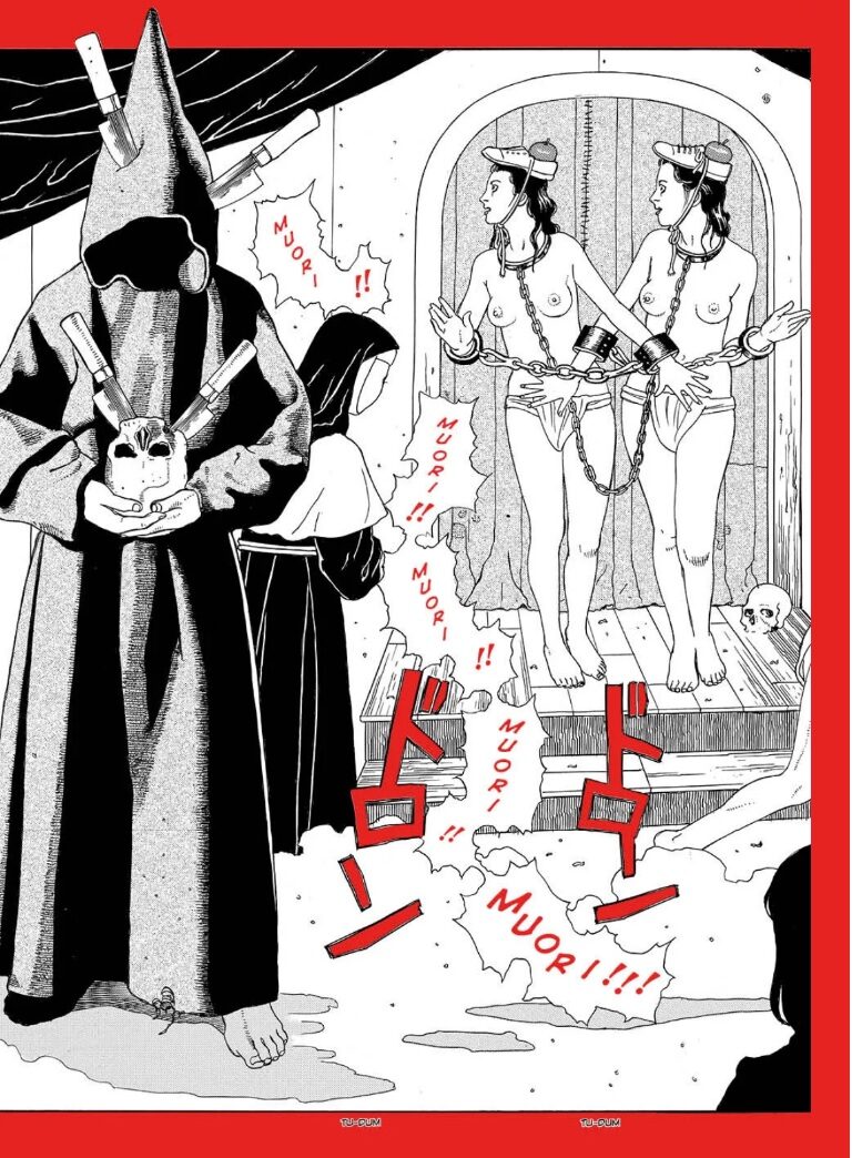 Una pièce di un teatro itinerante, in cui gli attori mettono in scena rappresentazioni a sfondo religioso con un’estetica che richiama l’horror e il sadomaso; fuori, intanto, un ragazzo con la chitarra canta per strada un verso di una canzone che recita “Figli del ressentiment…”. Inizia così Underground, l’opera di Suheiro Maruo recentemente pubblicata per la prima volta in Italia da Coconino Press, e questo inizio contiene già la dichiarazione dei temi che la percorrono.