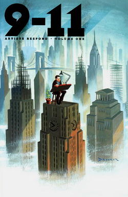 9-11: Artists Respond è articolato in due volumi: il primo supervisionato dalla congrega di case “minori” (a cui si aggiungono celebri marchi dell’underground come Top Shelf e Oni Press) ospita decine di fumettisti indipendenti accanto a stelle mondiali di prima grandezza (qualche nome? Peter Kuper, Will Eisner, Dylan Horrocks, Frank Miller, Alan Moore) ed è riconoscibile per una splendida copertina di Eric Drooker, raffinato illustratore e fumettista del New Yorker; il secondo (di cui esiste una edizione italiana per la Play Press) è tutto patrimonio DC, e sfoggia i maggiori talenti della propria scuderia: Neil Gaiman, Brian Azzarello, Jeph Loeb, Jim Lee e tanti altri pezzi da 90, tra cui spicca (non certo per meriti artistici, come vedremo) Stan Lee (la rassegna si apre con una cover di Superman firmata dal solito Alex Ross).