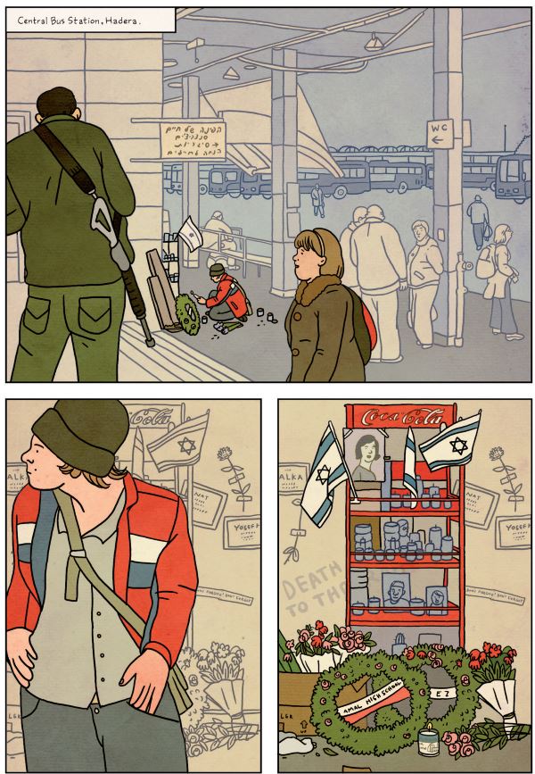 La tragedia narrata nel lavoro di Rutu Modan serve anche a raccontare la società israeliana e i suoi abitanti, anzi è evidente come lo scenario che emerge dal fondo di questa vicenda condizioni la vita d’ogni comparsa. Noi che abitiamo in un altro luogo e in una diversa società non possiamo che stupirci di fronte alla normalità di una vita scandita dalle date degli attentati e dalla conta delle inevitabili vittime.