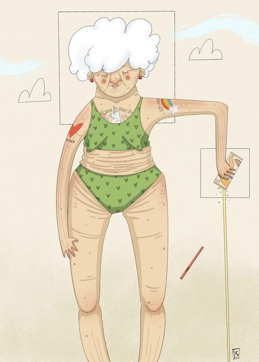 “Era una tipa tosta nonna Marina, tatuaggi e testa canuta sfoggiati con estrema disinvoltura. I suoi capelli in particolare, di un bianco candido e somiglianti a una nuvola, avevano ai miei occhi un non so che di rassicurante. Le volevo bene nonostante mi proibisse di bere bibite gassate. Persino in estate al mare se mi scovava a consumarne una, la sequestrava e la versava sulla sabbia. Di lei ricordo bene il bianco dei capelli e le bibite sprecate” – Vania Santi