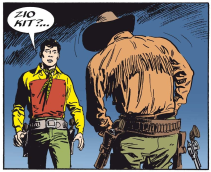 Il protagonista è praticamente lui, c’è la sequenza della sua cattura che dura una quindicina di tavole! Grande Carson, ammicca alle signorine del saloon e lascia intuire anche altro…