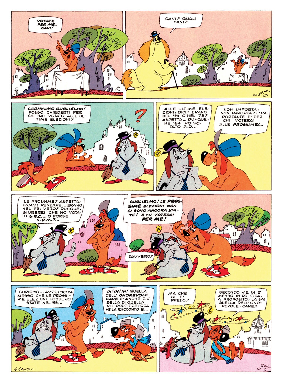 Si tratta di avventure comiche e surreali dalle meccaniche seriali a orologeria – ogni storia si chiude con la stessa immagine o quasi – di 3 – 5 tavole dove emerge dirompente la capacità di Sclavi di caratterizzare personaggi peculiari in pochissimi balloon e dove lo stile da Carosello di Gavioli costruisce l’ideale contrappunto.