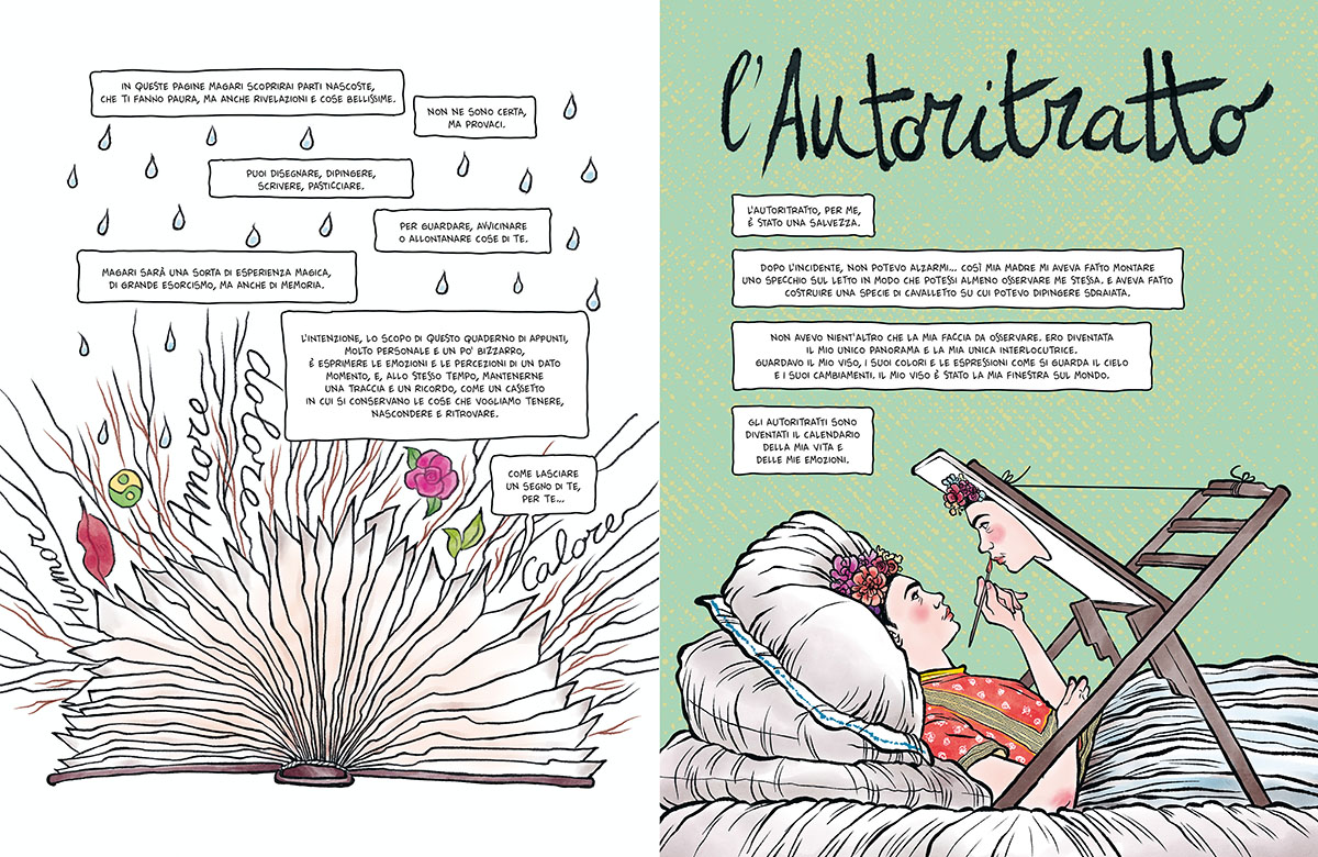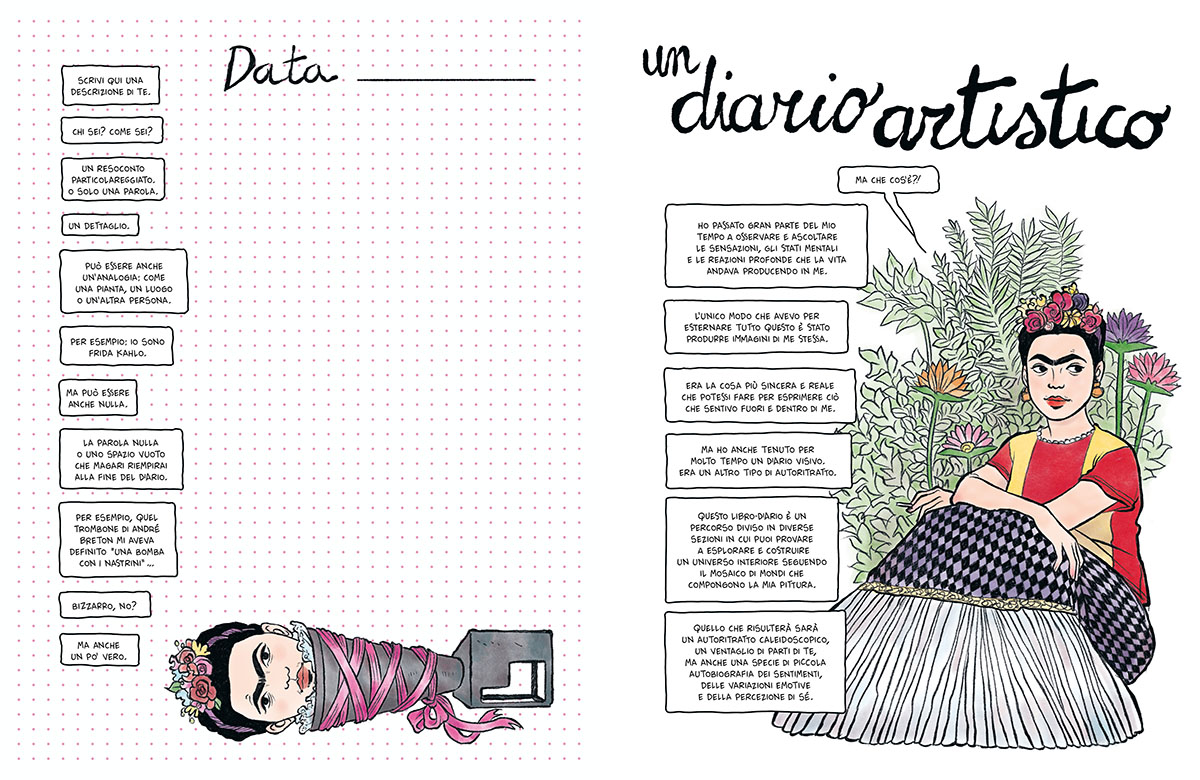 With Frida è suddiviso in sezioni tematiche che guidano il lettore nell’esplorazione di sé attraverso l’arte: si parte dall’autoritratto e dalla percezione del corpo, si attraversano le emozioni, il dolore, la memoria, il colore e i simboli, per arrivare alla natura, agli animali, agli abiti e all’identità. Ogni sezione è accompagnata da testi scritti in prima persona come se a parlare fosse Frida stessa, con il suo tono ironico, profondo, intimo. Il diario non impone regole: si può iniziare da qualsiasi pagina, tornare indietro, strappare, incollare, riscrivere. È un invito alla libertà creativa e alla scoperta di sé, a mettersi in gioco, a disegnarsi, a scriversi, a raccontarsi con sincerità e libertà.