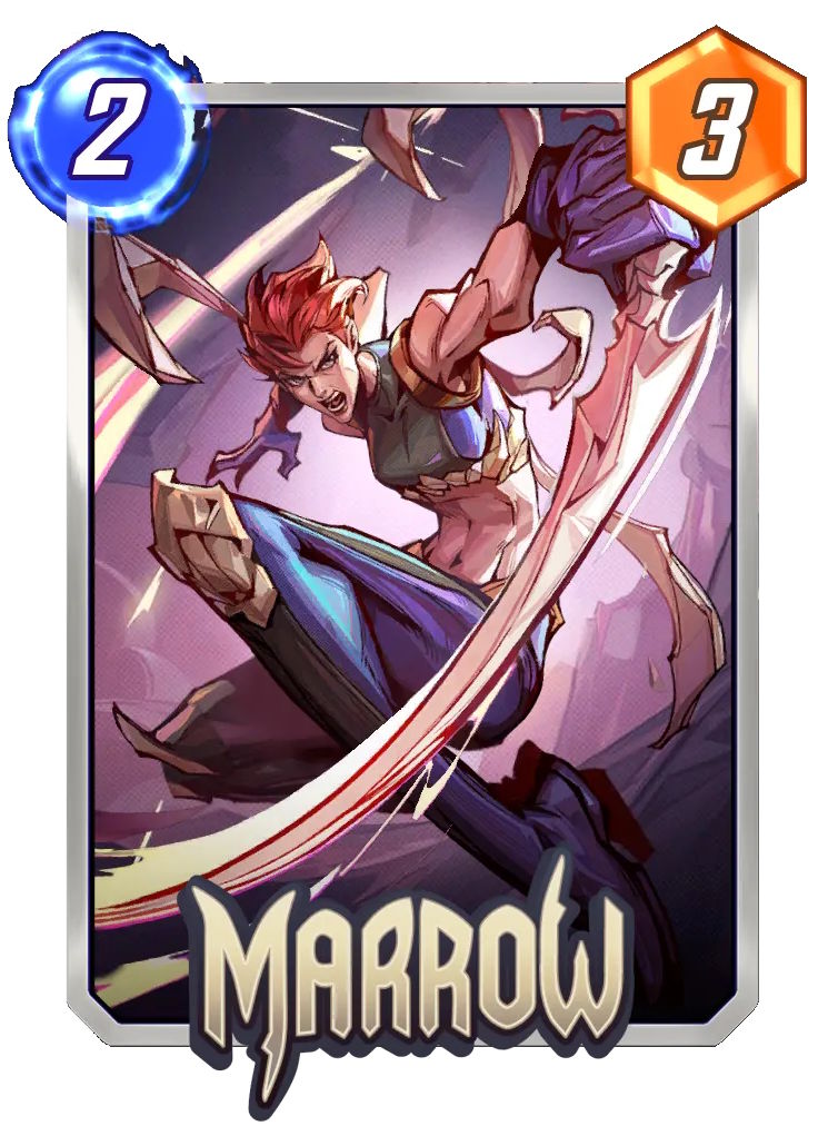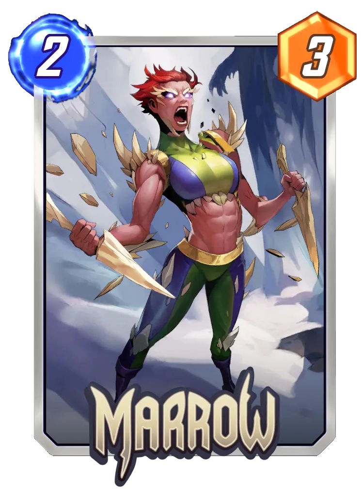 Guardando i numeri, è una 2/7 contando che per attivare il suo potere dobbiamo toglierla dal gioco. Però sappiamo anche che ci sono diversi modi per riportare in vita una carta. Pensiamo anche a un mazzo DestroyDestroy Mazzi che basano la strategia di vittoria sul distruggere le proprie carte per potenziarle o ottenere altri vantaggi. Es: Carnage, Venom, Death, Knull. con Moira X quali combinazioni potrebbe creare. O ancora Morgan Le Fay, Phoenix Force, Elixir. Marrow è una Serie 4, dubito possa diventare una carta fondamentale, però se vi piace creare mazzi non convenzionali può trovare un poco di spazio.