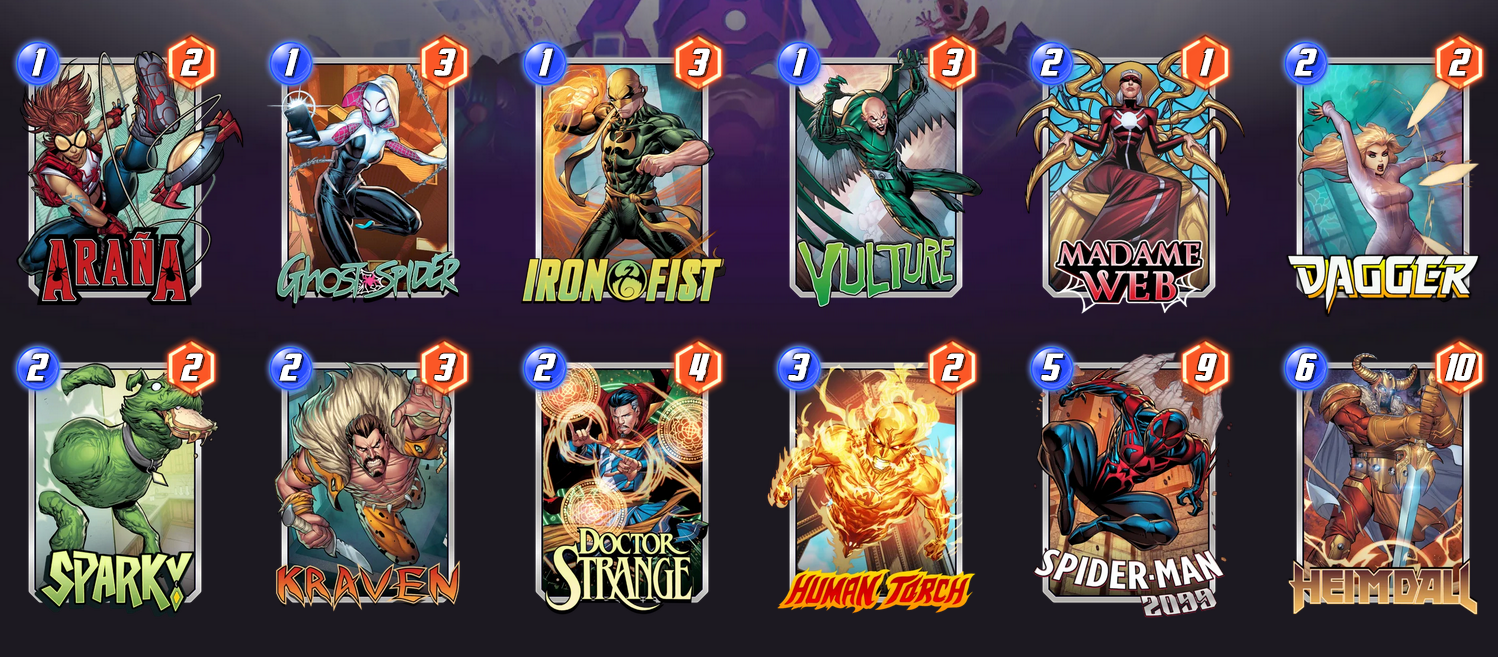 Anche se di costo basso, si mettono fin dai primi turni carte che permettono combinazioni per (che siano Alla Scoperta, all’Attivazione o come Effetto Continuo), come Arana, Iron Fist, Madame Web, Sparky… Poter settare le proprie mosse future e mantenere la flessibilità di dove giocare le carte è un grande vantaggio.